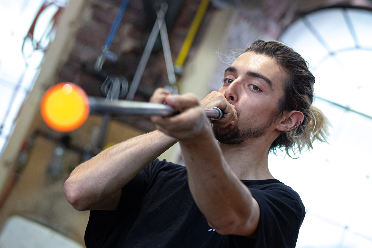 L’inspiration ? Une scène que beaucoup connaissent : cette boule qui glisse des doigts, ce petit instant d’angoisse avant le « crac ». Le designer l’a voulu visible et incarné : la surface de GRIP est couverte de motifs antidérapants — stries, croisillons, reliefs ergonomiques — rappelant les revêtements que l’on trouve plutôt sur un guidon de vélo ou le manche d’un outil. Mais ici, c’est en verre soufflé que se traduit ce motif : fusion entre tradition verrière et sensoriel.