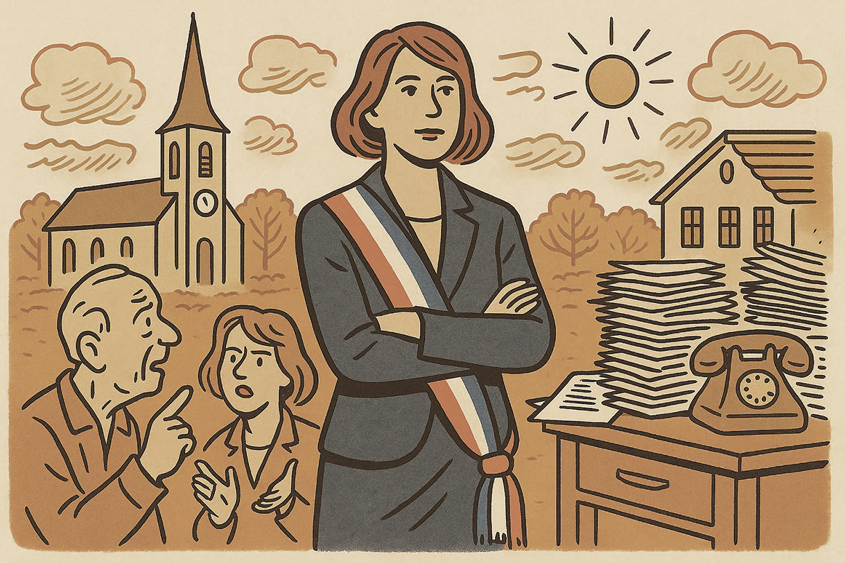 Illustration d’une maire portant l’écharpe tricolore, symbolisant les responsabilités et les contraintes du mandat d’élu local