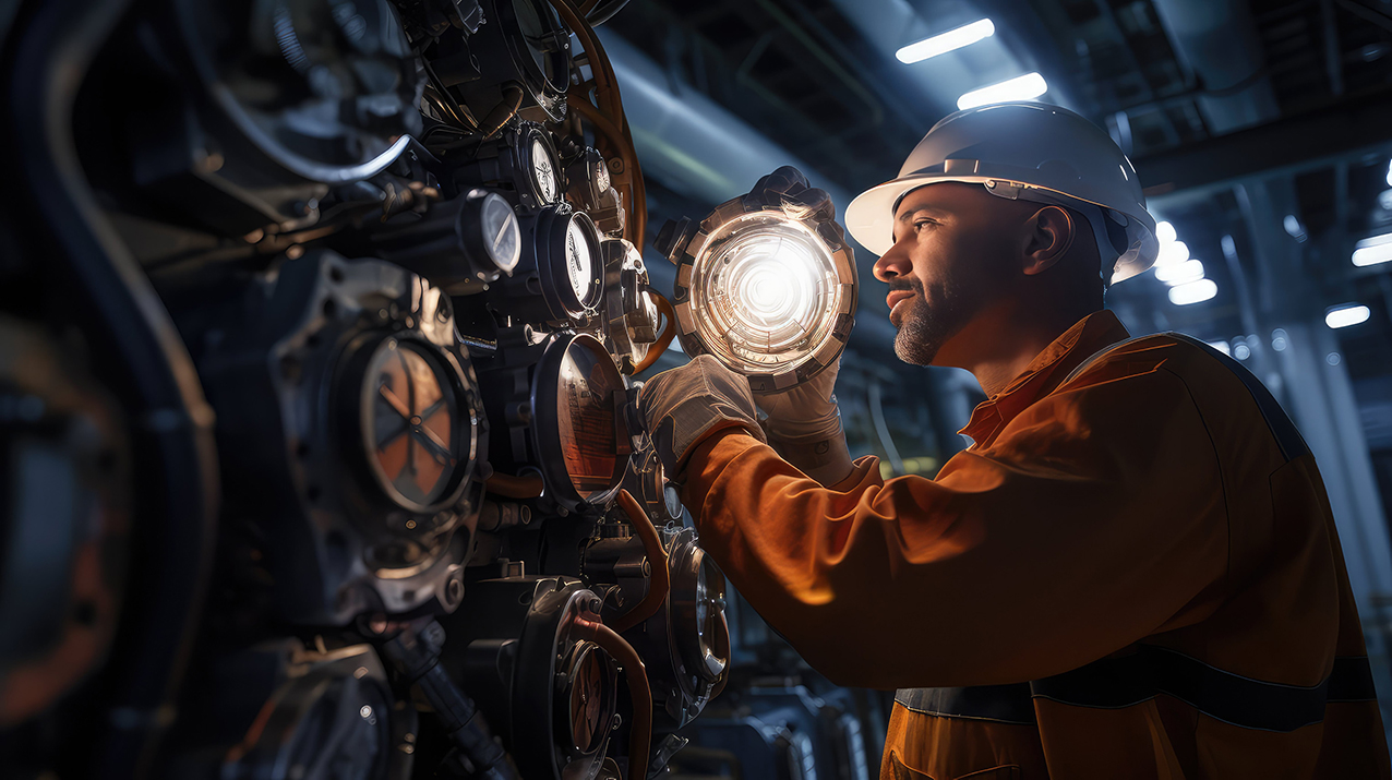Salarié en mécanique industrielle au Luxembourg inspectant une machine dans un atelier moderne.