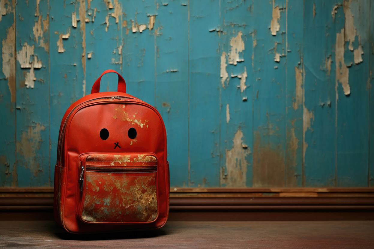 Cartable abandonné sur un sol usé, symbole de la solitude et du harcèlement scolaire.